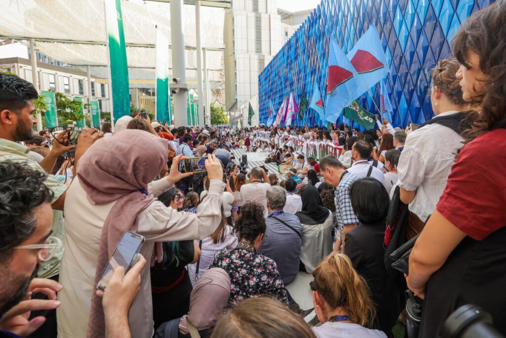 This was the largest solidarity gathering so far, although it still pales in comparison to mobilizations in other parts of the world since the Israel-Hamas war began on October 7. The United Arab Emirates, a federation of seven sheikhdoms, bans protests and prohibits speech that is deemed to create or encourage social unrest. However, it was not the Emirati authorities that tightened the protest space, but strict UN guidelines that governed previous COPs. The activist actions kicked off on Sunday, the fourth day of the climate talks.