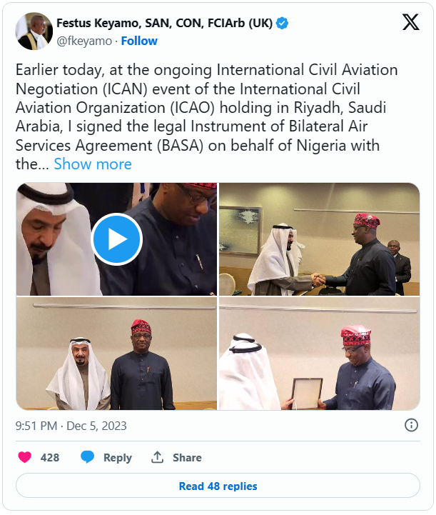 The Minister of Aviation and Aerospace Development, Festus Keyamo, has revealed on his social media handle (formerly Twitter) that Nigeria has signed a new air transport agreement with another country. This agreement is called BASA, which stands for Bilateral Air Service Agreement. BASA allows designated airlines from both countries to operate commercial flights that cover the transportation of passengers and cargo. According to Keyamo, this agreement was signed during the ongoing International Civil Aviation Negotiation (ICAN) event organized by the International Civil Aviation Organization (ICAO) in Riyadh, Saudi Arabia.